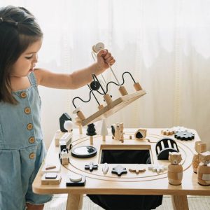What could possibly be more awesome than our all new Awesome Activity Table? It’s loaded with lots of fun stuff including 3 removable stacking toy animals, a mirror a shape sorter puzzle, train set, and so much more. The center maze pulls up to reveal a cotton storage bag to keep things tidy. Legs screw…