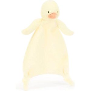 The Bashful Duckling Comforter is a portable patch of softness. Designed with an un-stuffed body yet delicately squashy paws and bobble feet, making it easy for little hands to grab hold of and comfort themselves. Please note: This product does not ship to Ohio or Massachusetts due to state regulations regarding recycl