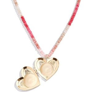 Good vibes, guaranteed! This necklace is adorned with pretty pink beads and a gold heart locket. Sparkling with pavé detailing, it’s a cheerful, eye-catching piece that adds instant joy to your everyday look. Beaded necklace with heart shape locket Length: 16"; 3" extender. Material: Glass stones. Brass casting. Acryl