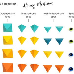 Explore the colors of honey and nature in this 36 piece set includes 6 octahedrons, 12 tetrahedrons, 12 half-tetrahedrons, 6 eyes (in total 36 pieces) + Leaflet + Limited Edition "Inspiration Book". With a large set you can either build one large construction or several smaller ones and share the process of creating wi