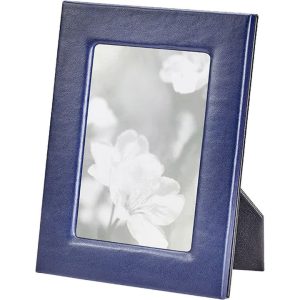 This rich leather frame beautifully accents your favorite photo. Handcrafted frames, wrapped in leather on both sides, with a sturdy metal easel. Convenient rear drop-down door for easy and frequent access to photos. Overall Size: 6" x 8" Opening: 4" x 6" full-grain leather