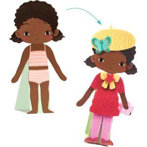 Allows your child to design outfits and styles for 12 characters – 6 boys and 6 girls. With elements of self-adhesive felt, stickers and crystals, each character can have a unique look that reflects the imagination of the toddler. By choosing and matching outfits and accessories, the child exercises precision, percepti