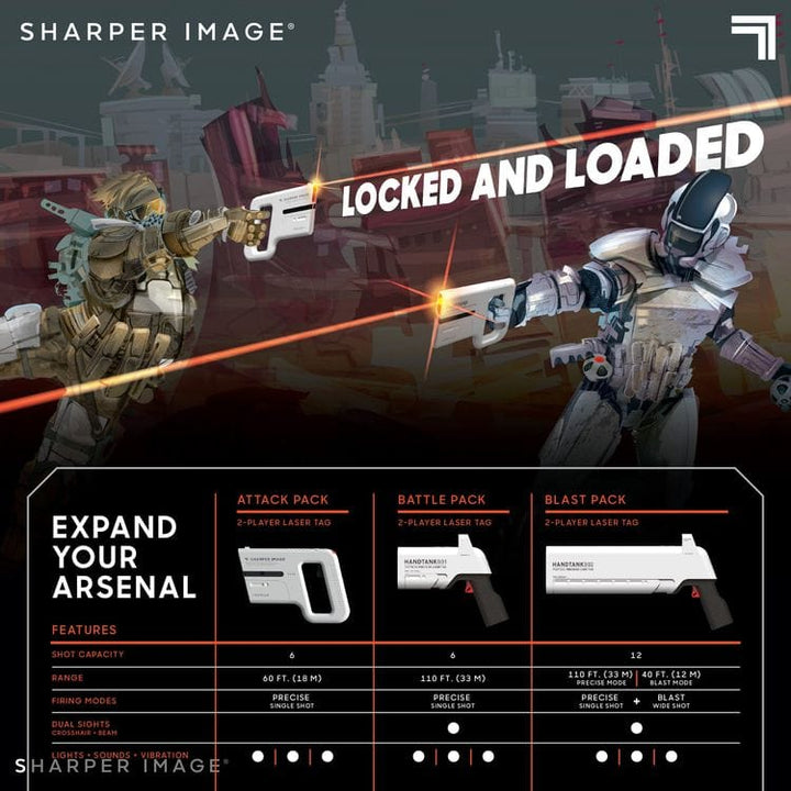 Bring the arcade experience home with SHARPER IMAGE 2-Player Laser Tag Handtank Attack Pack! The set includes two laser blasters for a two-player laser tag battle! Great for indoor or outdoor use, laser tag is the perfect way to get up and get moving and still have fun doing it! Includes 2 Mini Cannon X-Blasters Push a