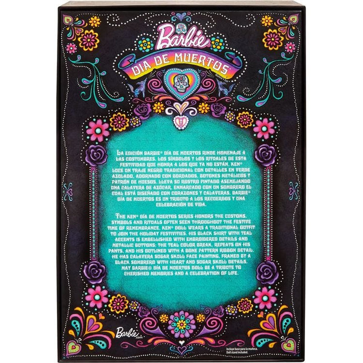 Celebrate the vibrant and beloved Mexican holiday with our 2024 DÃa de Muertos Collection. Ken doll looks striking in a black satiny suit with turquoise accents and embroidered details. He completes his look with calavera face paint, a silver belt, and a wide-brimmed sombrero. While sold separately, both Barbie and Ke