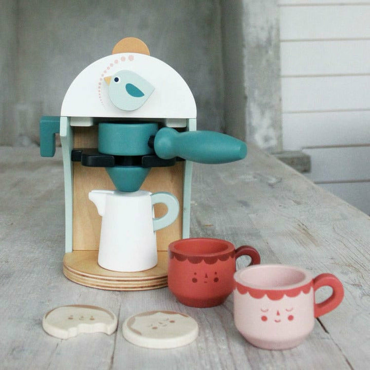 Who would like a cappuccino? The perfect addition to our Bird's Nest Café, this babyccino maker is styled in soft mellow colours and has a cute bird clacking dial. This set has 5 coloured pods, a pod holder, 2 coffee cups decorated with faces, 2 coffee fills, 2 coffee toppers, a milk jug and 2 biscuits. PLAY AS PART OF