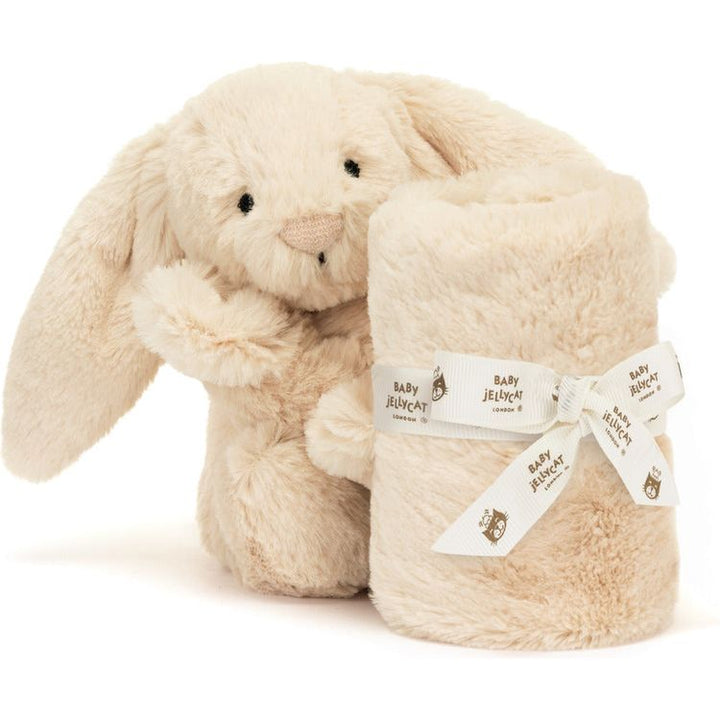 Bashful Luxe Bunny Willow Soother offers the perfect comfort in luxuriously soft biscuit-gold fur. Little ones can cuddle up with the blanket or the tiny Bashful Luxe Bunny Willow holding on to the corner for the most joyful of dreams. This soother is tied with a grosgrain printed ribbon and presented in an elegant Jel