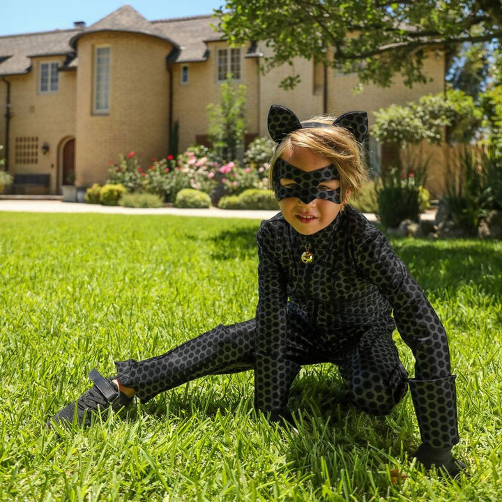 Unleash your inner feline hero with our A Leading Role Cat Noir Child Dress Up Set; the officially licensed Cat Noir 4 pc. costume set celebrates a decade of purr-fect partnership! Featuring an iconic ear headband, sleek eye mask, and a stylish zipper-front jacket with bell charm and belt tail detail, with matching pan