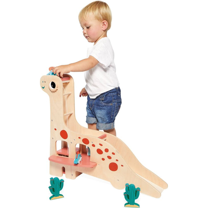 VRRRoom! Back to the pit for the T-rex! Here is a magnificent garage in the shape of a diplodocus. The 4 rolling dinosaurs can go off for a jaunt and come back to the garage to rest… The garage is equipped with a lift allowing direct access to the first and second floors. To get back down? There are two possibilities