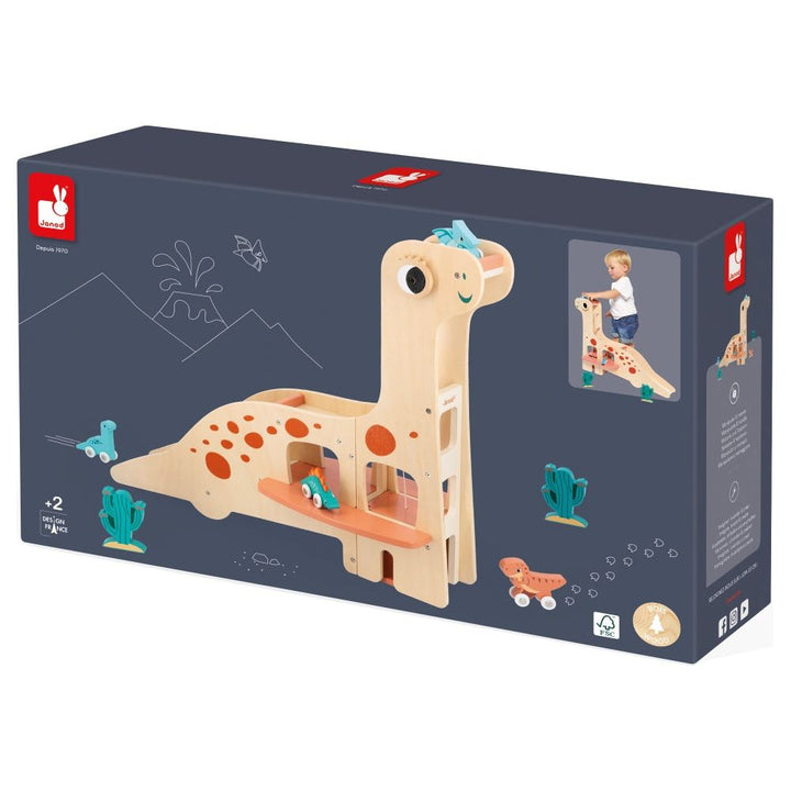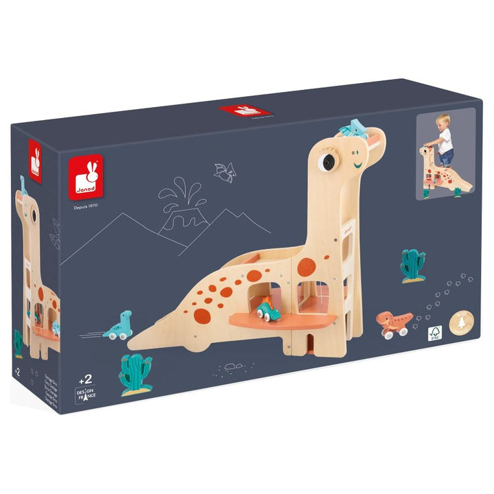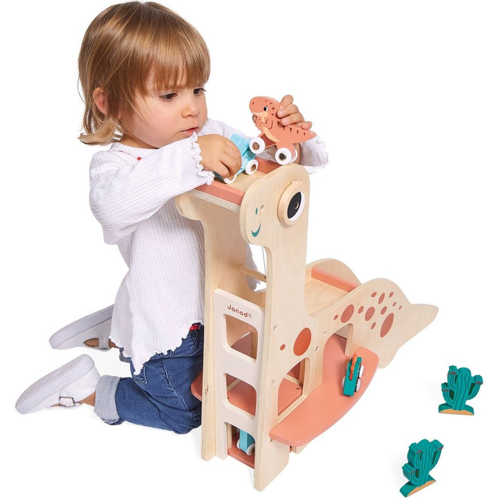 VRRRoom! Back to the pit for the T-rex! Here is a magnificent garage in the shape of a diplodocus. The 4 rolling dinosaurs can go off for a jaunt and come back to the garage to rest… The garage is equipped with a lift allowing direct access to the first and second floors. To get back down? There are two possibilities
