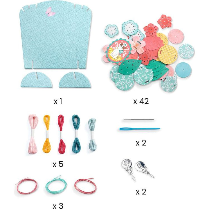 A comprehensive creative kit to make an embroidered multi-row necklace. Flat-stitch embroidery is used on the pre-punched beads to make it easier to pass the needle through. Once embroidered, simply attach the flat rubber bands to the back of the beads to assemble them, creating 3 necklaces that you can wear on their o