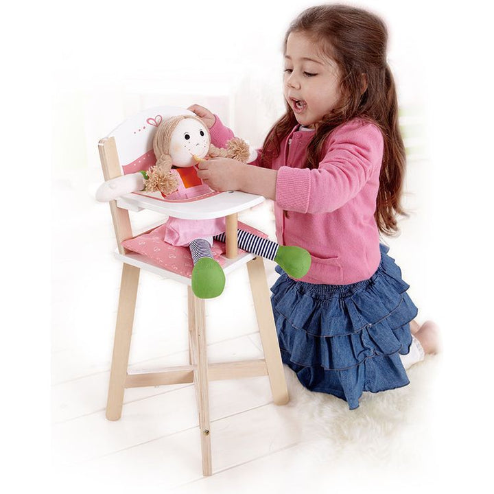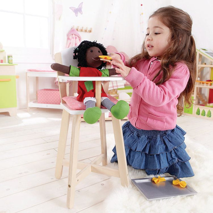 This mini highchair encourages dolls to sit up straight and eat their food. Ask what "dolly's" favorite foods are. Watch how your child guides the doll to eat. Dimensions: 25.6 x 57 x 26.3 cm Ages 3+ PLEASE NOTE: There is a shipping fee associated with this item.Â