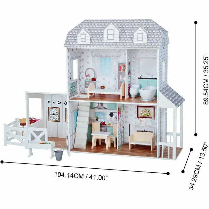 Give your child's doll collection a stylish place to stay with the Olivia's Little World by Teamson Kids Dreamland Farm Dollhouse with 14 Accessories. This rustic dollhouse features a 2-level design with a white and gray exterior for a fun and colorful addition to any playroom. The intricate decorations, patterns, and