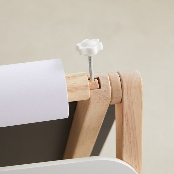 Get your little artist creating with our Easel Does It! Our wooden easel sits neatly on the floor, and comes with a paper roll, 4 giant circle magnets to hold papers on to the magnetic chalkboard, and 3 paint cups. Flip sides, and you have a dry erase board. Cup holders and shelf fit easily in and out of the slots, a