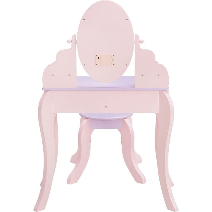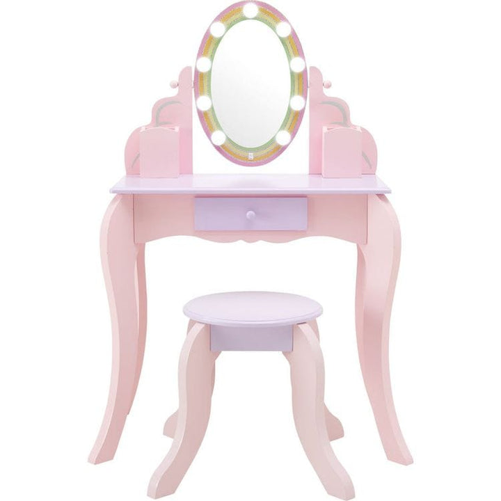 Fantasy Fields' Little Princess Rapunzel Vanity Playset is a fun addition to playing dress-up. Made of engineered wood with rounded corners and carved cabriole legs, the vanity table features an acrylic oval mirror, surrounded by LED lights. In pink and lavender, it features a rainbow accent around the mirror, where an