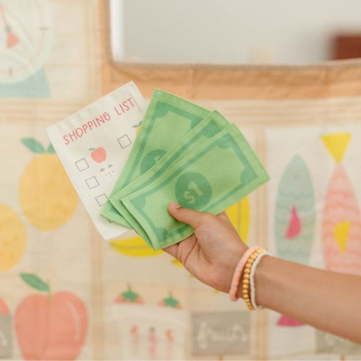 This canvas two-in-one storefront playset is easy to hang, takes up almost no space, and inspires hours of pretend play. One side is a farmers' market printed with a weighing scale, produce, flowers, and more. The other is a bakery showcasing beautiful glass-topped cakes, pastries, and a cash register. Printed on both