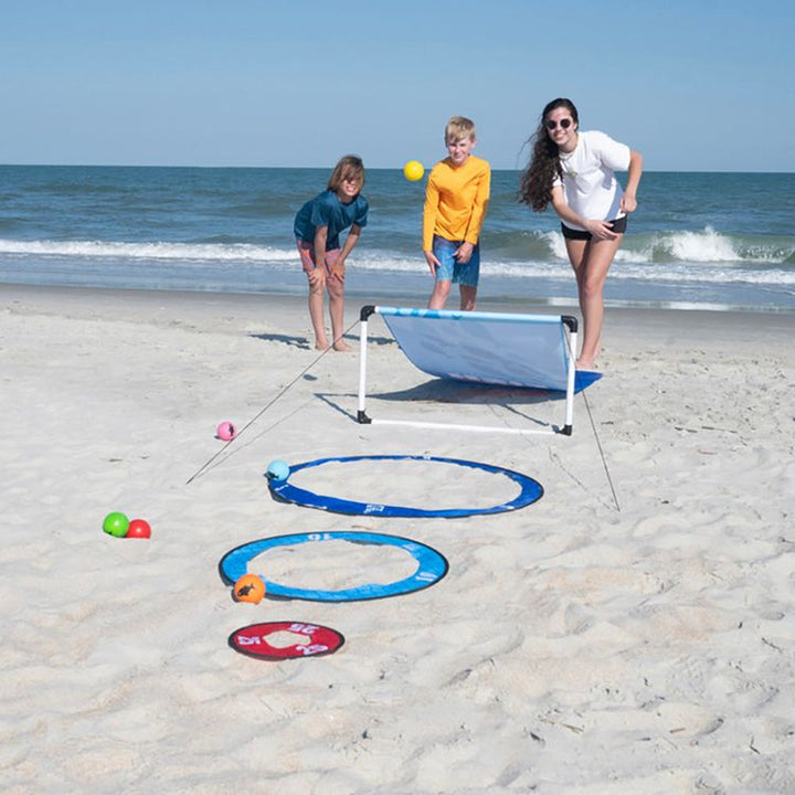 FLY schools of FISH up the ramp, high into the sky, and try to land them in the “nets” to score points! It's fun, fast-paced, and simple to play. You can compete with up to 6 players, either individually or as teams. SIMPLE SCORING: There are 3 target "net" rings provided: the large ring is 5 points, medium is 10, and