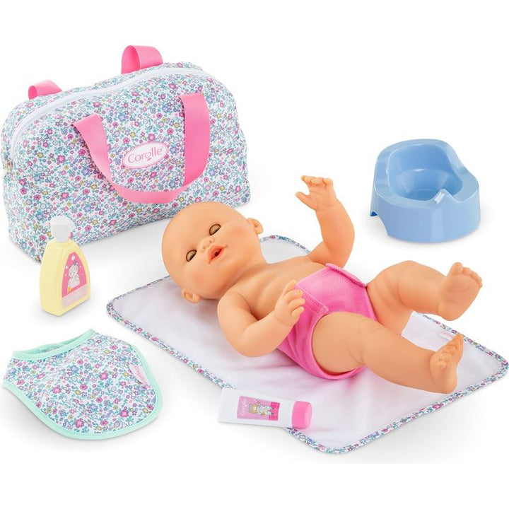 The Changing Bag and Accessories for a 14 inch Corolle doll offers all the essential accessories for changing your baby doll. Floral print on bowling bag, bib, and towel Cleansing milk, tube of cream, diaper fabric, bib, potty, velvet towel, zipped bowling bag to store everything. Doll not included Suitable for ages 2