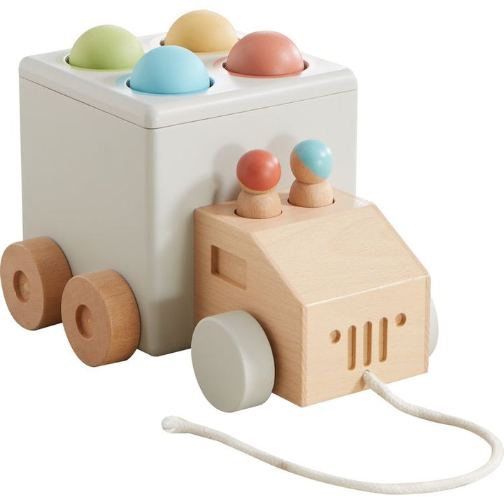 So much to keep baby busy with our Hammer Time Pull Toy. Not only is it a fun pull toy with little wooden drivers, but it’s also a pounding toy and a color matching game. Kiddos will love to pound the giant wooden balls through the matching color holes, then let them all come out by releasing the rear door. Comes wi