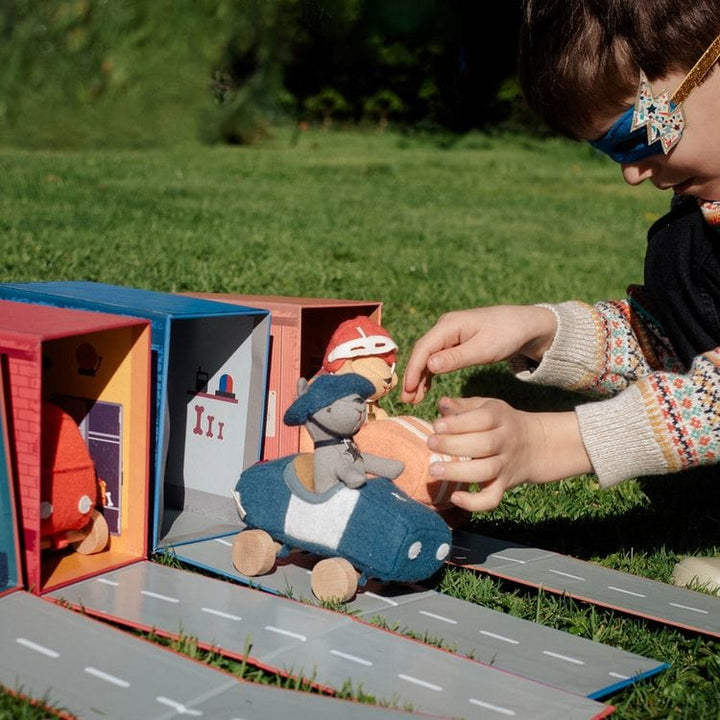 Unleash the excitement with our Holdie Worldâ„¢ Dog-Gos. When tails wag and mischief is afoot, an unlikely hero takes charge of law enforcement. Sporting a safety helmet and shiny badge collar, Officer Dog-Go fearlessly takes the wheel of justice. When the day is done, Dog-Go Officer loves to park in their garage box, re