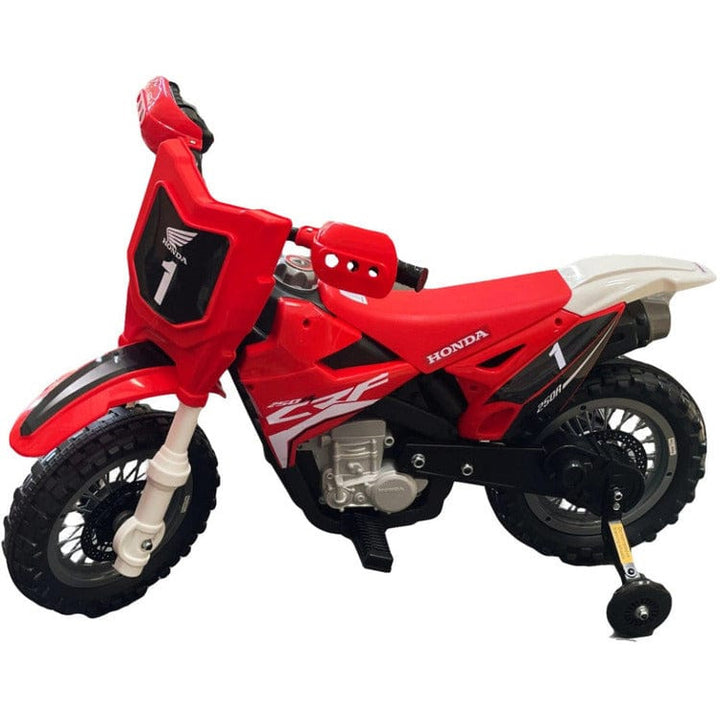 Licensed Honda crf250r comes with an upgraded 6-volt battery & motor, has realistic engine, start sound, comes with training wheels, has alloy like rims, features stylish decals for attractive look. Best for ages 2-5 years This item does not qualify for free shipping. Additional shipping costs will apply due to the