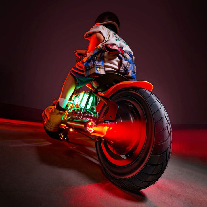 The HYPER GOGO Challenger 12 Plus is an exhilarating electric ride-on designed for kids, merging bold style with reliable performance! Its rugged 12-inch pneumatic tires ensure a smooth ride across diverse surfaces, while the eye-catching chopper aesthetic is enhanced by features like simulated smoke effects and vibran