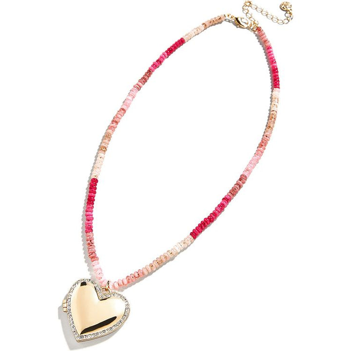 Good vibes, guaranteed! This necklace is adorned with pretty pink beads and a gold heart locket. Sparkling with pavé detailing, it’s a cheerful, eye-catching piece that adds instant joy to your everyday look. Beaded necklace with heart shape locket Length: 16"; 3" extender. Material: Glass stones. Brass casting. Acryl