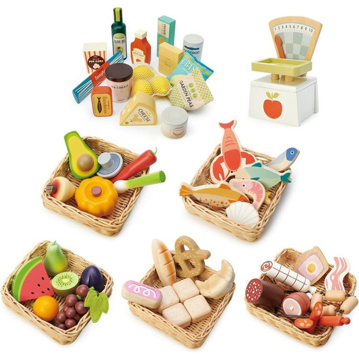 The ultimate pretend play grocery set! Set includes: Supermarket Grocery Set, Market Scales, Veggie Basket, Seafood Basket, Fruity Basket, Bread Basket, Charcuterie Basket. Ages 3 Years + PLEASE NOTE: There is a shipping fee associated with this item.