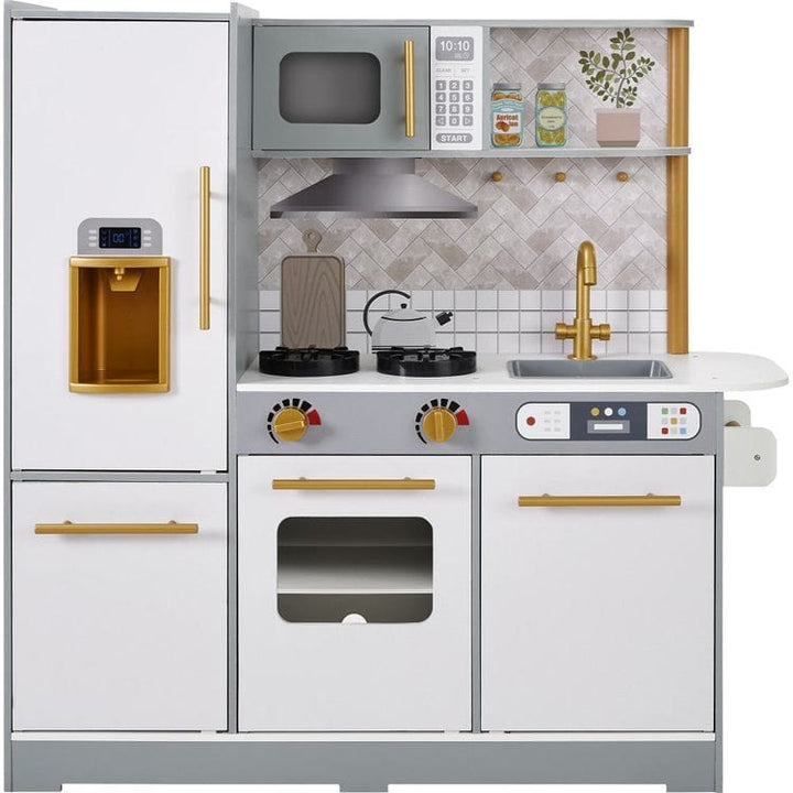 Teamson Kids Little Chef Springfield Play Kitchen is a feature-packed play kitchen with a magnetic refrigerator, stove, sink, and microwave for realistic play. Interactive fun includes an ice dispenser with three pretend ice cubes, color-changing burners, and knobs that turn and click. Stocked with a pot and pan with a