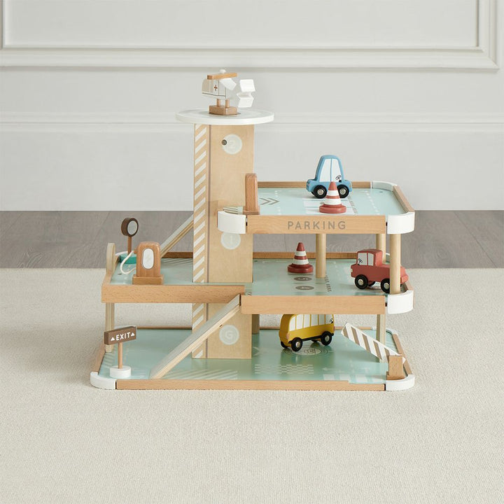Your little tot will drive into fun with our Little Tot Parking Lot. Our quality wooden parking lot has 3 floors of imaginary play including ramps, helipad and helicopter, 3-floor crank elevator, 4 motor vehicles, safety cones, signs, gas pump and charging station, and more! Simple assembly, and you’re ready to go.Â