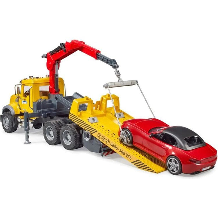 Tow trucks are versatile tools in traffic. Regardless of whether they load up broken down vehicles and take them to the workshop or remove illegally parked vehicles. The MACK tow truck featuring many functions has now been added to the Bruder range. The platform can be lowered to recover vehicles. It is also possible t