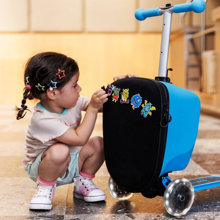 Fun on the go for little ones! The Micro Scooter Luggage Junior LED Patch & Play is both children's luggage and a scooter in one, making it the perfect travel companion for kids between the ages of 3-5 years. Plus, the fun velcro patches turn travel time into playtime! Let the imagination run wild with Monster or M