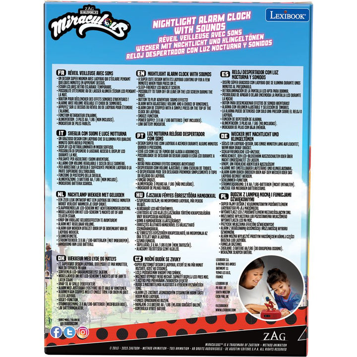 A wonderful design with Ladybug lighting up for a few minutes when you press on the top of the clock/character. LCD backlit screen. Possibility to completely turn OFF the LCD screen to enjoy a night without any light. Button to trigger Miraculous’s inspired sound effects! Alarm with a choice of Miraculous-inspired ring