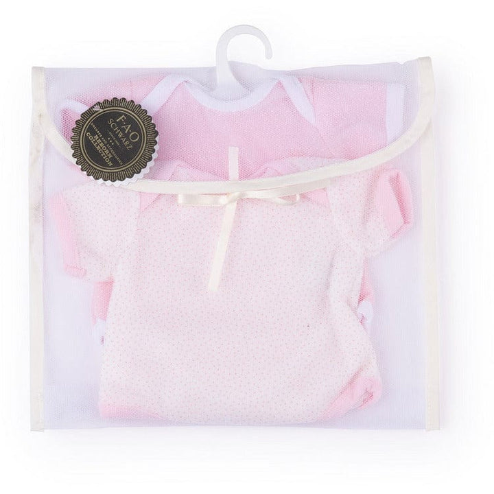 Set of two bodysuits: one white bodysuit with pink polka dots and pink edges, one pink bodysuit with white polka dots and edges. Includes 2 baby onesies Hand wash. For 40cm dolls / My FAO DollsÂ