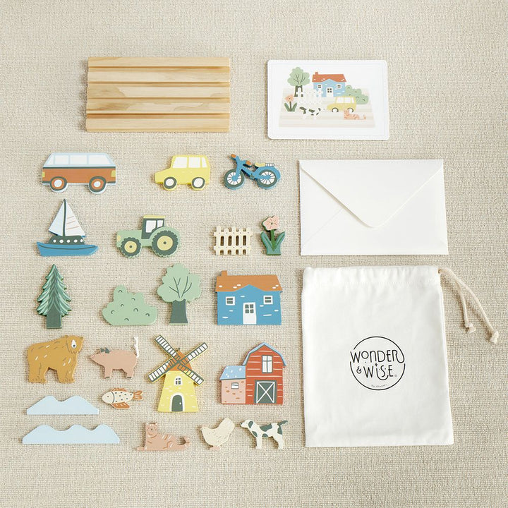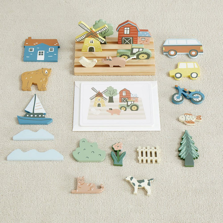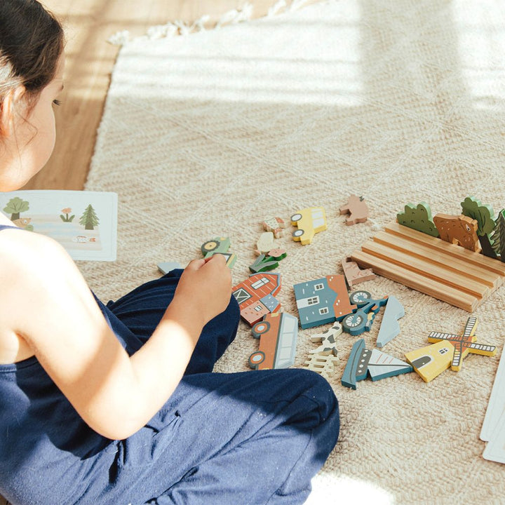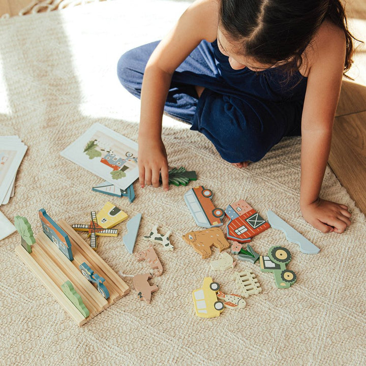 Our My Town Picture Matching Game is a great and fun way to help your kiddos learn placement and sequencing by matching the wooden objects to the pictures. Our high-quality set includes a chunky wooden base that holds 21 assorted vehicles, trees, houses, bikes and more. 12 cardboard pictures with scenes to match. L