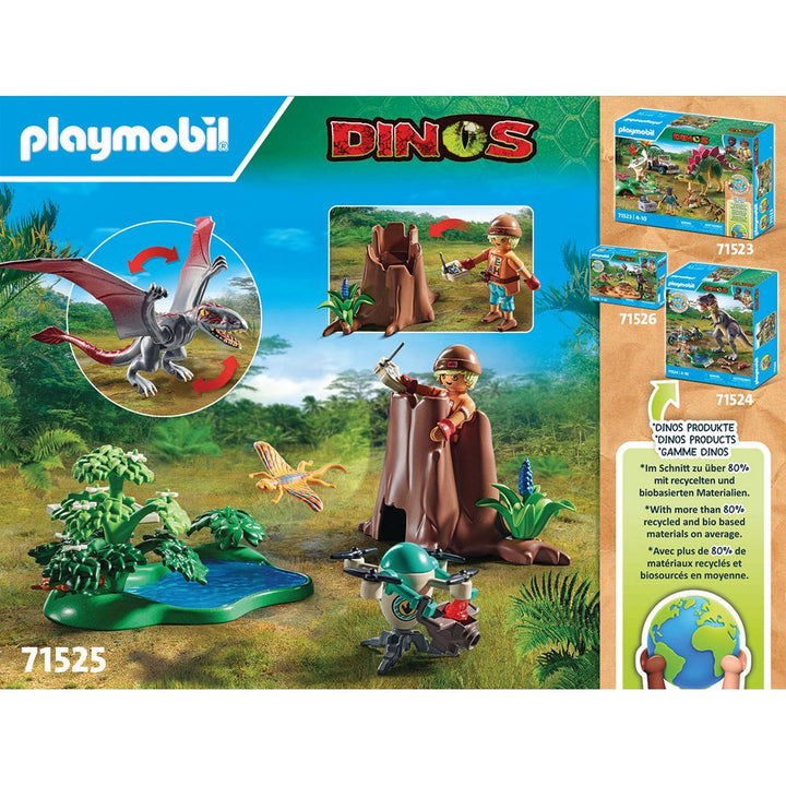Step into the world of dinosaurs with the Observatory for Dimorphodon. Hidden within the hollow tree stump, the dino researcher observes the Dimorphodon while it searches for food. Using the flexible drone with camera, he captures close-up shots without disturbing the large flying reptile. Then it is time for him to ex