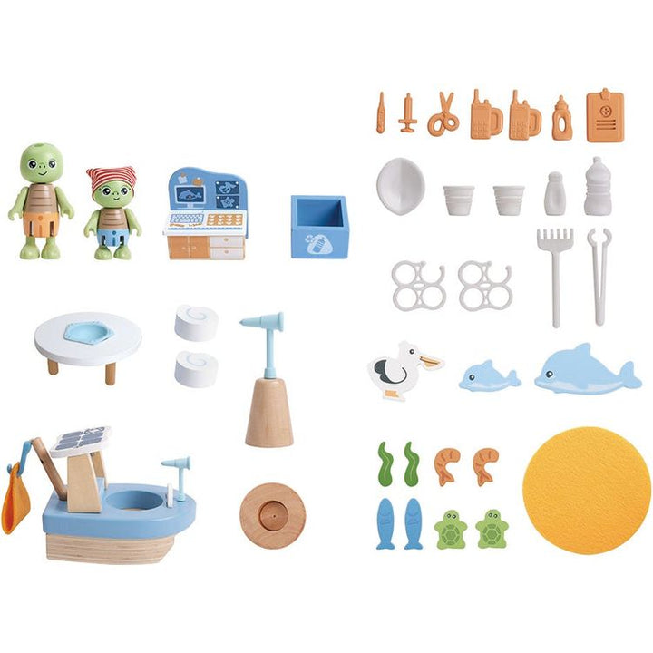 Learn how to care for our oceans with this ocean rescue base playset. Including two turtle figurines and five animals, children will help their turtle friends keep the ocean safe and clean and to look after any animals in trouble. The set features two floors to explore with plenty of activities like a spiral slide and