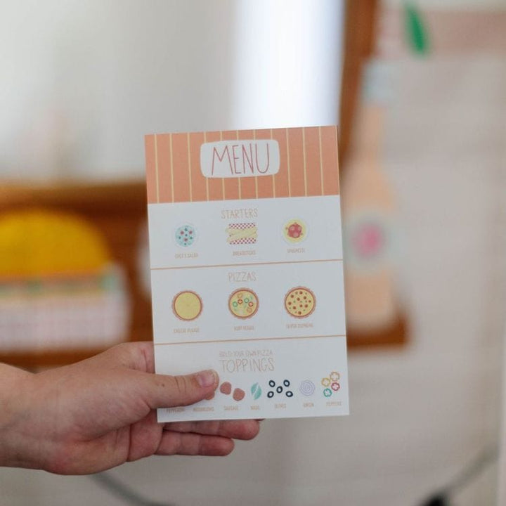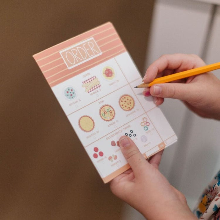 Your little one is in for a treat as they embark on their pizza-making journey. Get ready to jot down orders with our handy order notepad – whether it's for cheesy breadsticks or mouthwatering pizzas, we've got it covered. With a delightful assortment of vibrant cardstock ingredients, this set has everything they need