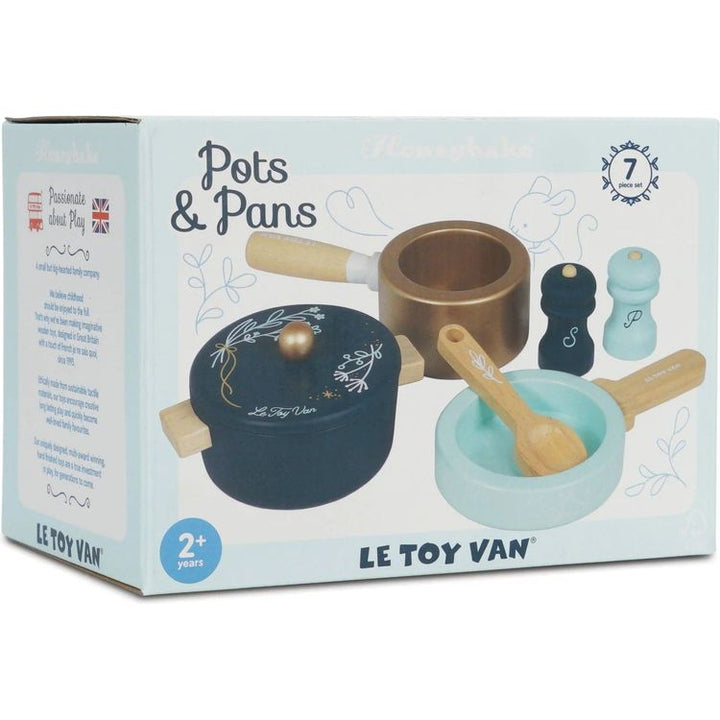 A smart wooden cookware set for budding young chefs. Cook up a feast with this sweet toy which comprises a casserole pot with lid, saucepan, frying pan, wooden spoon, spatula and salt & pepper. Crafted from sustainable solid wood and hand painted in bright hues using water based, child safe paint. A great addition