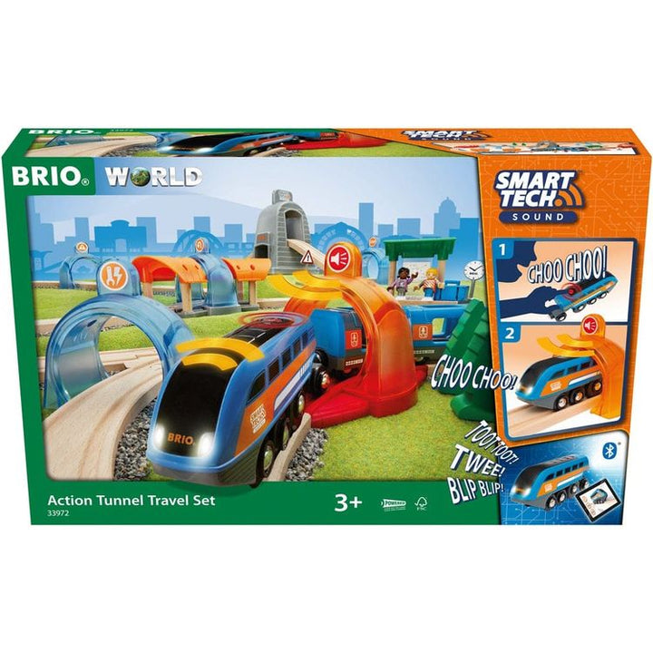 Take control of the play with this 37-piece interactive toy train set – the Action Tunnel Travel Set. Added Smart Tech Sound technology allows the battery-powered Record & Play Engine to communicate with its surroundings, automatically responding to Smart Tech accessories with various train actions like multicolour