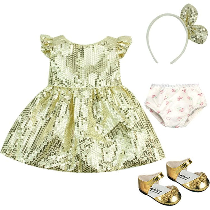 "Carly" has beautiful auburn hair, blue eyes and stands 18 inches tall. She has a soft, huggable torso and posable, vinyl arms, legs and face. Her eyes open and close when laying down, and she has French tipped nails! Carly is wearing an elegant gold sequin dress and a matching bow headband. She also comes with white f