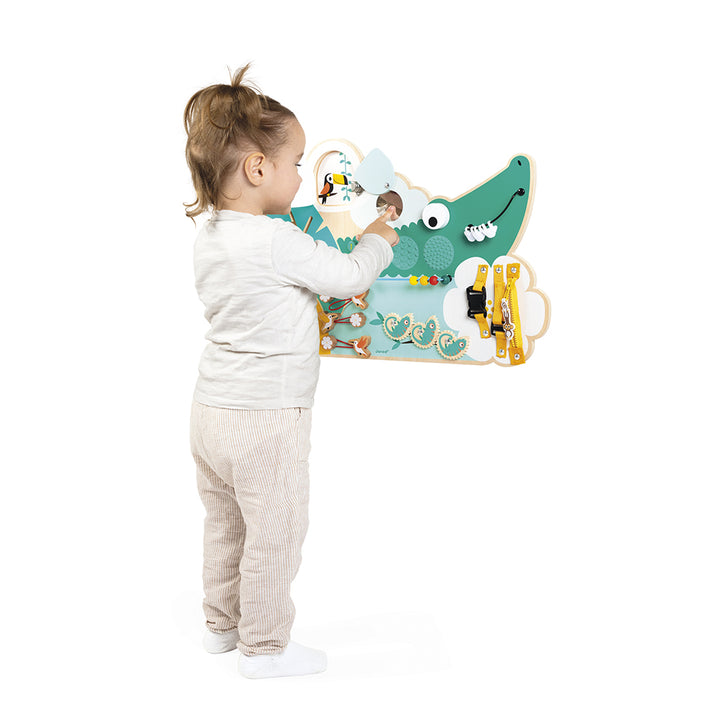 Hidden in the middle of the jungle, Croco is just waiting for your child to come and play and discover more than 14 activities! This comprehensive toy includes: a maze to manipulate, a rotating eye with sound, 3 straps with different fastening systems, chameleon gears, a bell, a metal lock, a hidden mirror, an abacus w