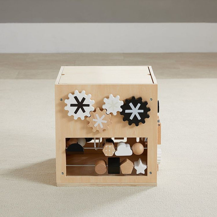 Time to start thinking outside the box with our Busy Box for babies. Baby will be busy sorting 12 shapes on one panel, playing with shapes abacus and gears on another panel, scooting vehicles across a track on a different panel, and lots of activities on the last panel. Add a beaded maze on the top to complete this s