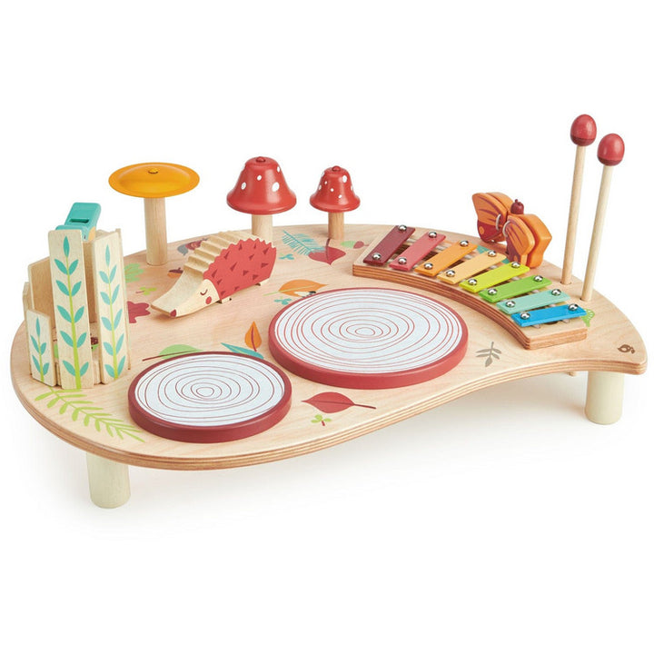 Compose a forest symphony! Musical notes roll off the xylophone and the mushroom bell tops jingle as you hit them with your acorn stick. Bang the tree trunk drums, blow through the birdie whistle, clack the butterfly wings, sound an echo with the stirring wood chime. Rub the stick along the hedgehog back, what a hulla