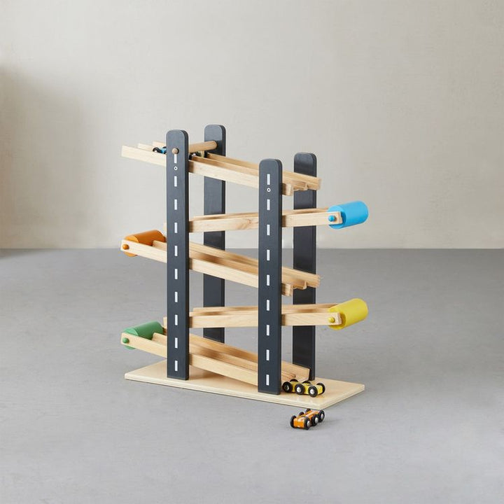 They’ll be off to the races with our Fast Track. Brightly painted with non-toxic paint and 5 natural wood slopes let the races begin. Includes 4 race cars for independent play or with friends. Ages 3+ Material: Plywood Care Instructions: wipe clean with damp cloth PLEASE NOTE: There is a shipping fee associated with