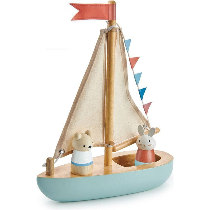 Ahoy there! A traditional solid wood sailing boat evocative of summer time seascapes. Best friends Bubble and Squeak are on top deck, enjoying the views. With 2 fabric sails and some stylish bunting, these 2 friends have the coolest boat in the harbor. The boat cannot be put in water. PRETEND PLAY Happy birthday to you