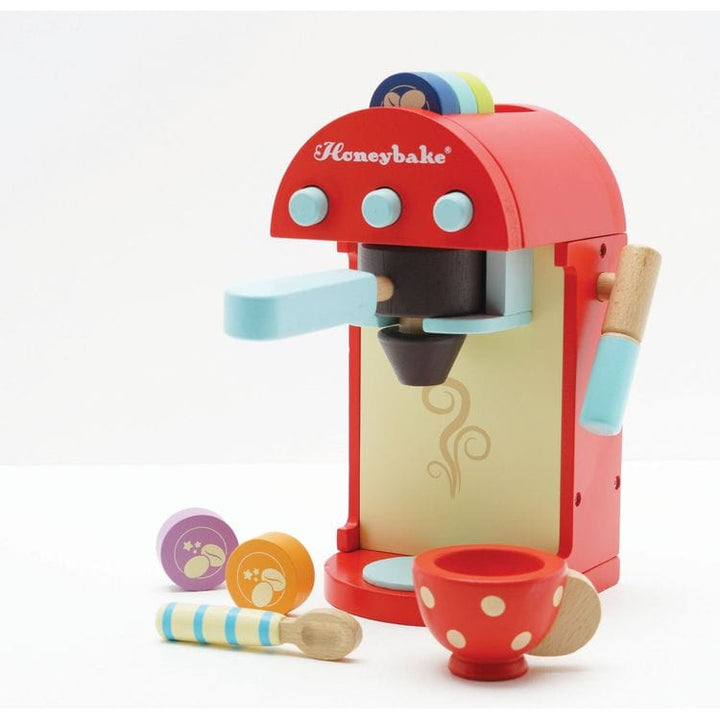 Who would like a drink? A brightly painted café-style drinks making machine. Includes colourful water-based painted pods to insert in the removable filter, a cup and a spoon. The pods are neatly stored on the top of the machine.  Ages 3 yrs + Material: 20% Beechwood, 60% Teawoood, 20% MDF This product is a toy. Remov